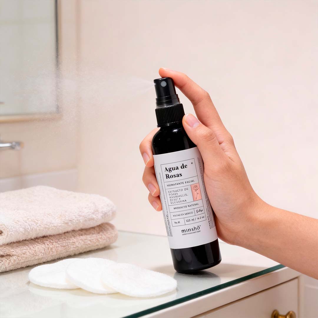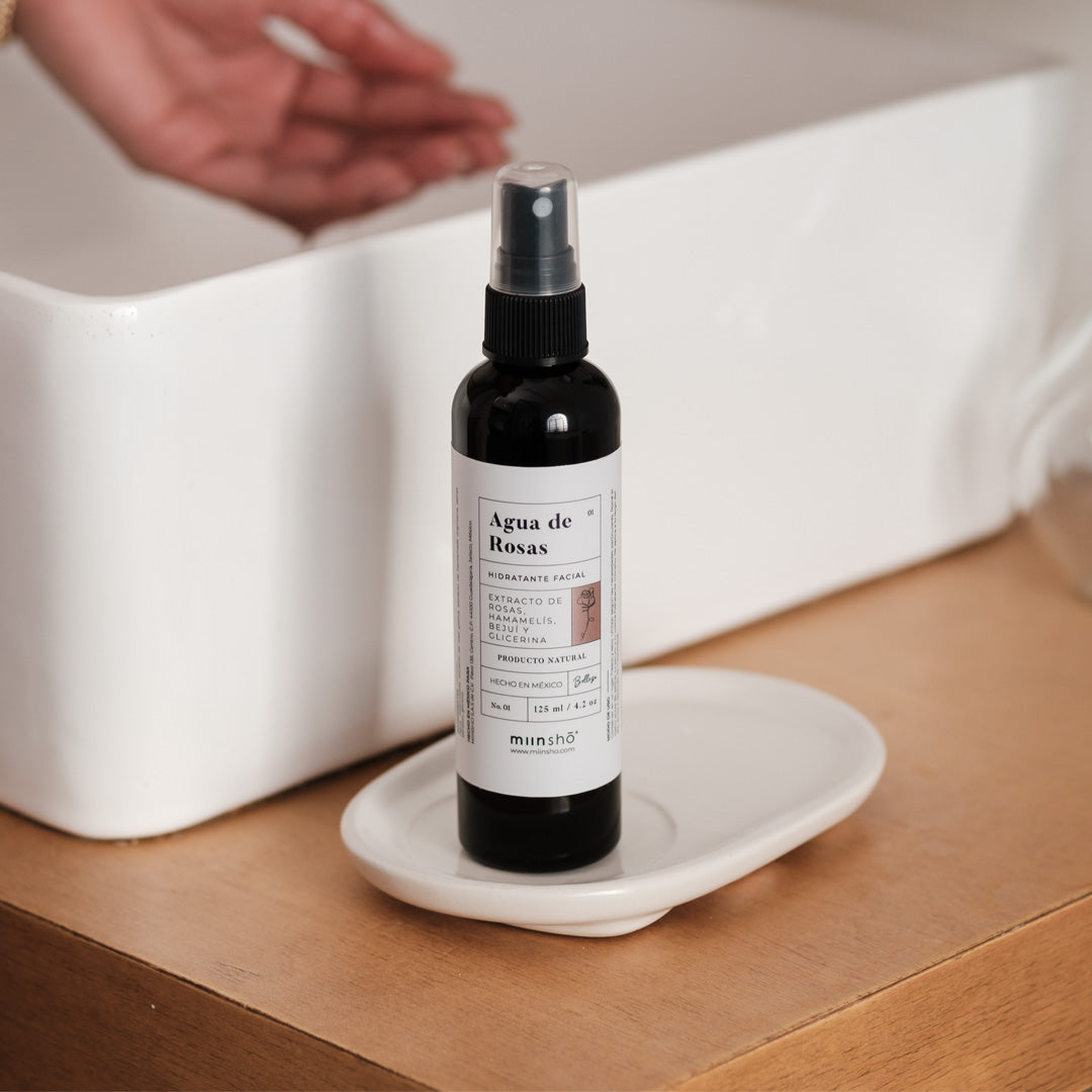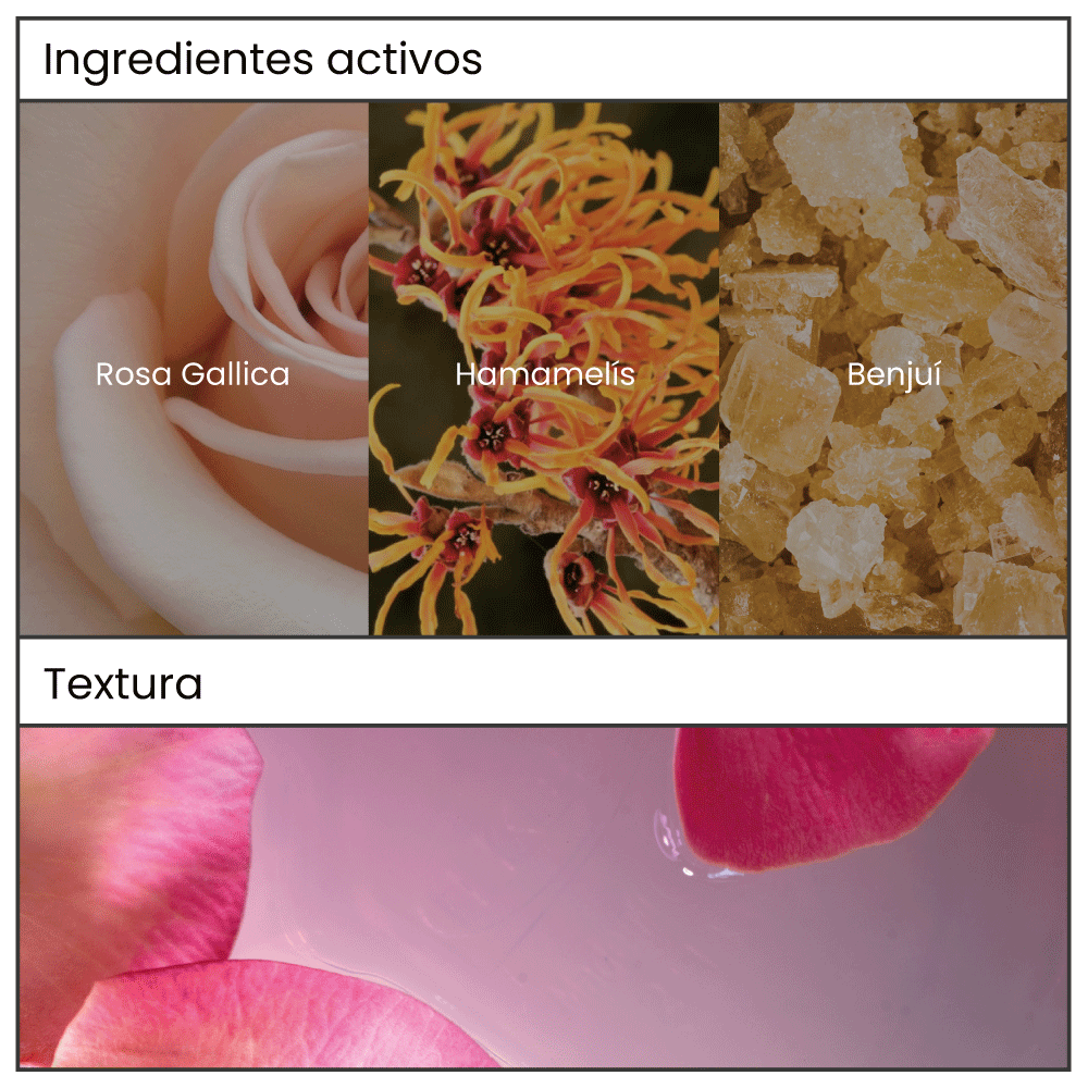 Aqua, rosa gallica, hamamelís virginiana, styrax benzoin, glicerol.