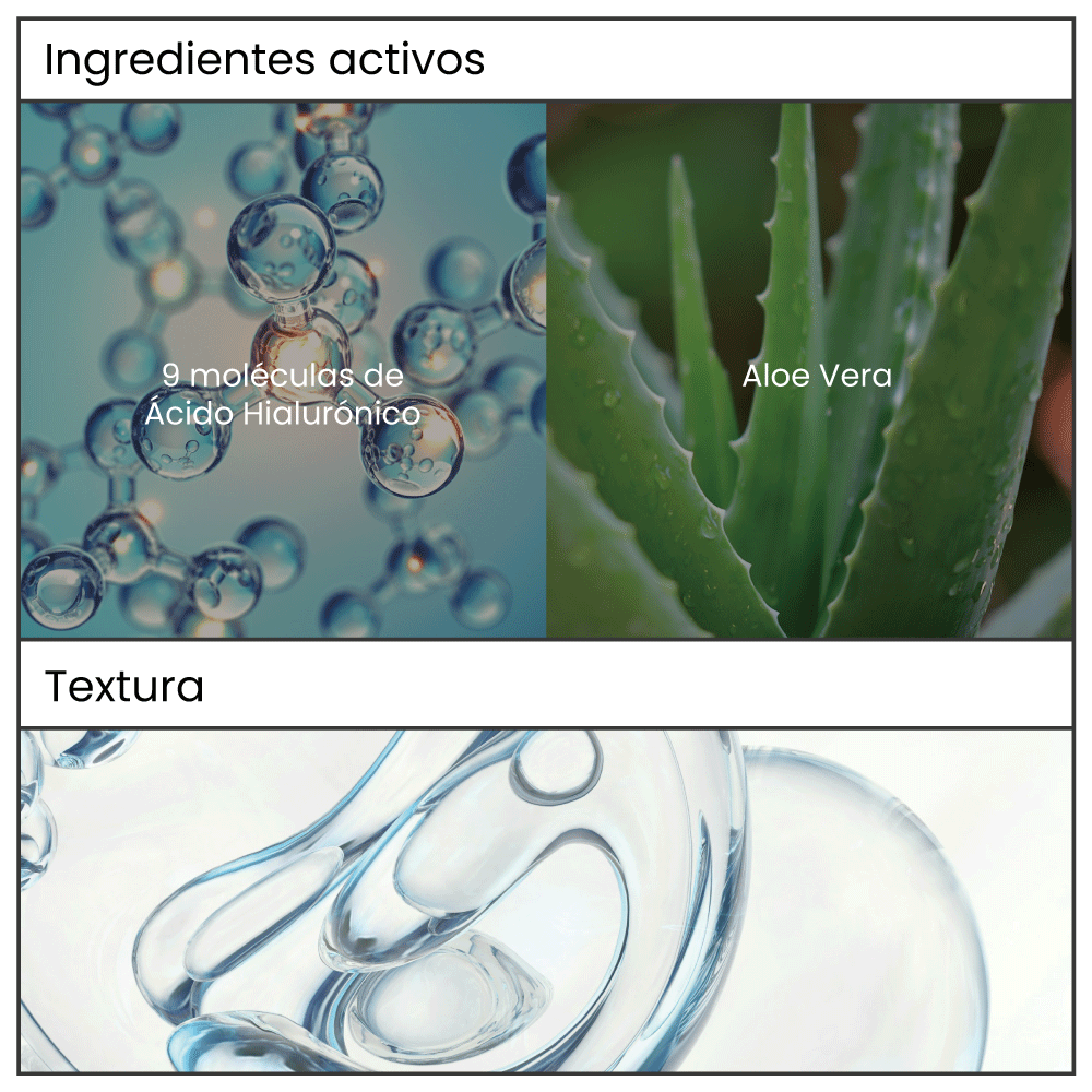 Agua Destilada, Extracto Acuoso De Hoja De Aloe Barbadensis, Propanediol, 1,2-Hexanodiol, Hialuronato De Sodio, Clorhidrato De Lisina, Glicerina, Fructosa, Urea, Ácido Cítrico, Maltosa, PCA De Sodio, Lactato De Sodio, Trehalosa, Alantoína, Glucosa, Goma Xantana, Butilenglicol, Glucosa, Hialuronato De Sodio, Extracto De Chondrus Crispus, Ácido Hialurónico Reticulado, Hialuronato De Hidroxipropiltrimonio, Ácido Hialurónico Hidrolizado, Hialuronato De Sodio Acetilado, Ácido Hialurónico, Crospolímero De Hialuronato De Sodio, Hialuronato De Sodio Hidrolizado, Hialuronato De Potasio, Caprilil Glicol, DMDM Hidantoína, Fenoxietanol, Alcohol Bencílico, Hidroxiacetofenona.